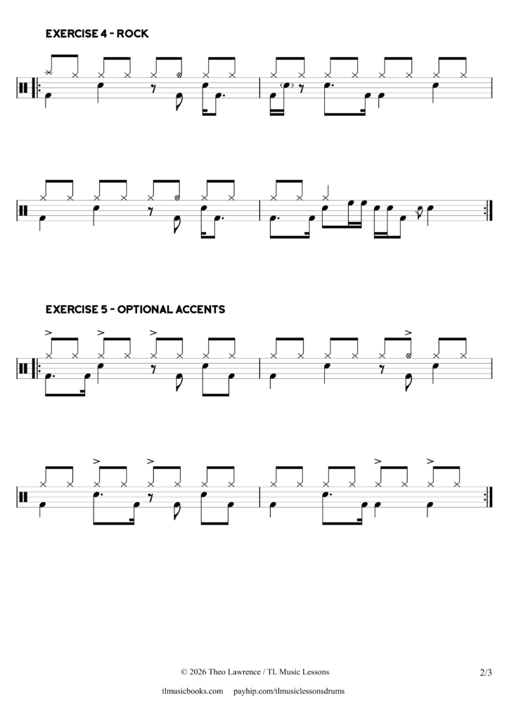 I have selected these 6 exercises because they give a good insight to the book as well as being a really useful resource on it’s own. Perhaps a drum teacher would print this off for their pupils to work on, or a drummer might want to focus on rock drumming and use this on it’s own for several sessions.